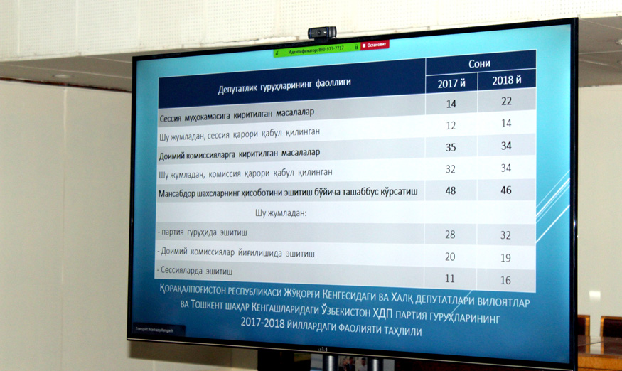 Ўтган давр мобайнида парламентдаги партия фракцияси ва партия ташкилотлари, маҳаллий Кенгашлар депутатларининг ҳамкорлигини мустаҳкамлашга жиддий эътибор бердик. Бир қатор қонун лойиҳаларни уларга жўнатдик, уларга муносабат билдирилди. Ўтган йилнинг 140 тадан ортиқ қонунлар қабул қилинди. Электоратимиз манфаатларига алоқадор кўплаб қарор ва фармонлар чиқяпти. Лекин маҳаллий партия кенгашлари раисларининг муносабати ҳақида ОАВларида чиқиши суст даражада.