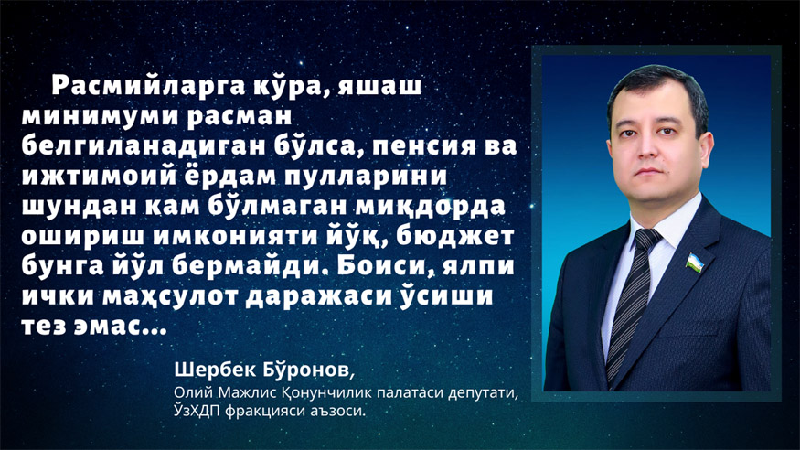 Бу фикр Конституциямизнинг 39-моддасида пенсиялар, нафақалар, ижтимоий ёрдам бошқа турларининг миқдори расман белгиланган тирикчилик учун зарур энг кам миқдордан оз бўлиши мумкин эмаслиги белгилаб қўйилгани билан изоҳланган эди. Яъни, расмийларга кўра, яшаш минимуми расман белгиланадиган бўлса, пенсия ва ижтимоий ёрдам пулларини шундан кам бўлмаган миқдорда ошириш имконияти йўқ, бюджет бунга йўл бермайди. Боиси, ялпи ички маҳсулот даражаси ўсиши тез эмас.