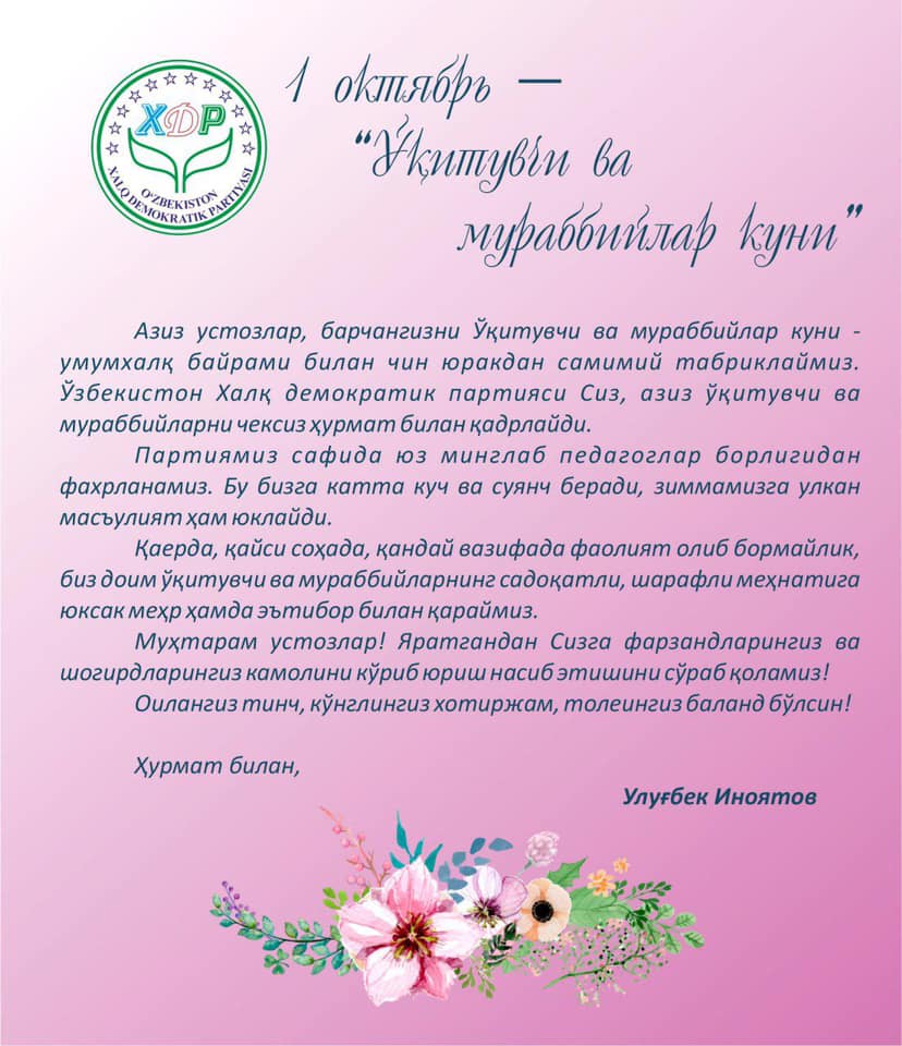 ХДП Марказий Кенгаши раиси Улуғбек Иноятовнинг Ўқитувчи ва мураббийлар куни муносабати билан табриги