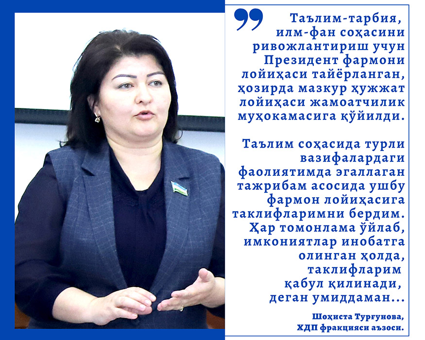 Азиз устозлар, ҳурматли ота-оналар, ҳаётда катта тажрибага эга устозларни фарзандларимиз, жамиятимиз келажагини белгилашда муҳим аҳамият касб этувчи ҳужжат лойиҳасига таклиф-мулоҳаза билдириш имкониятидан унумли фойдаланишга чақираман.