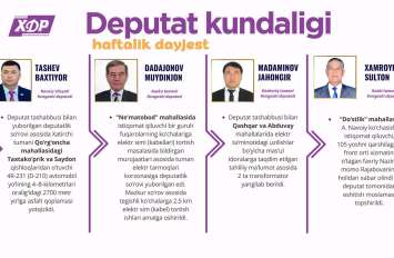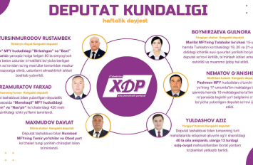 Шу кунларда Олий Мажлис Қонунчилик палатаси депутатлари ҳудудларга чиқиб фуқаролар билан учрашувлар, ижтимоий соҳа объектларида ўрганишлар олиб бормоқда...