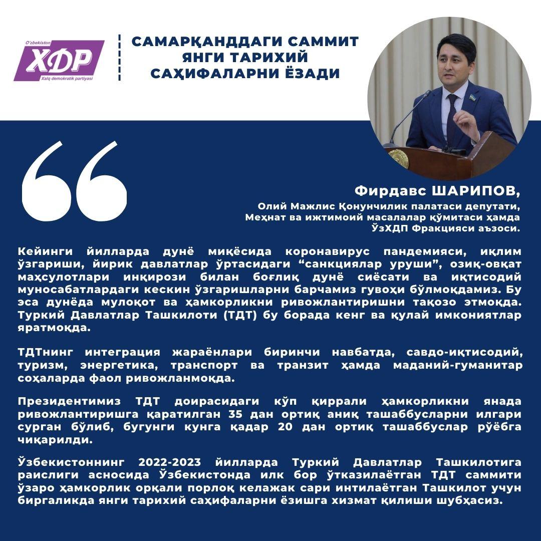 "Халқ сўзи" газетасининг бугунги сонида Олий Мажлис Қонунчилик палатасидаги Ўзбекистон Халқ демократик партияси фракцияси аъзоси Шарофиддин Назаров билан суҳбат чоп этилди